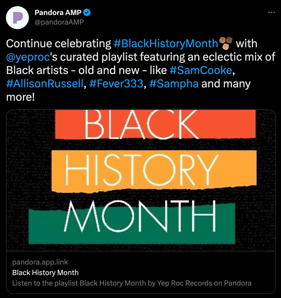 February 2023, Pandora AMP tweeted about the official Yep Roc Music Group playlist I created for Black History Month! Featuring some of my favorite artists such as — Rage Against the Machine, Erykah Badu, Otis Redding, and more š¶ Listen Here.